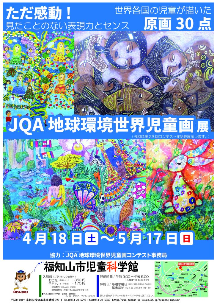 | 内容 | 「JQA地球環境世界児童画コンテスト」は、一般財団法人日本品質保証機構(JQA)と国際認証機関ネットワーク(IQNET)の主催、UNICEF東京事務所の後援により、地球環境の大切さを学ぶ機会を提供することを目的に、世界中の7歳から15歳までの子どもたちを対象に1999年から毎年開催されています。優秀作品の原画については、特別企画「地球環境世界児童画展」として日本各地で展示されています。 当科学館では9回目となる今回の展示では、「ひとと自然の幸せな時間」をテーマに83の国と地域から9,947点が応募された第23回コンテスト作品から、特に優れた作品30点の原画を展示します。 世界の子ども達から寄せられた作品は、多彩な技法に驚きのセンスなど純粋に芸術作品としての高いクオリティに感動する作品ばかりです。 科学館が自信をもってお届けする特別展です。ぜひお越しをお待ちしております♪ |