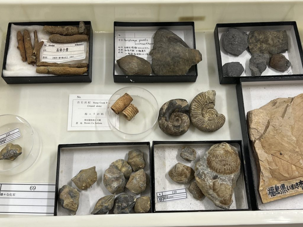 | 内容 | 昨年に引き続き「歴史とロマンを語る化石展」を今年も開催します。 京都府北部・兵庫・福井・三重・岡山などの近隣の府県から、植物化石・貝化石を中心に約800点の化石を 74の標本箱に収納して展示しています。アンモナイト・フズリナ・ウミユリなど、貴重な化石を是非ご覧下さい。 |